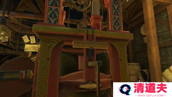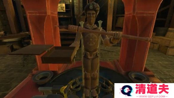 13、拉动左侧柱子中的把手,拖拽木偶右侧的把手,把木质毛笔放在人偶的手中,点击机关上的红色宝石,得到半截笛子,移动机关里的滑块,得到迷你钥匙。