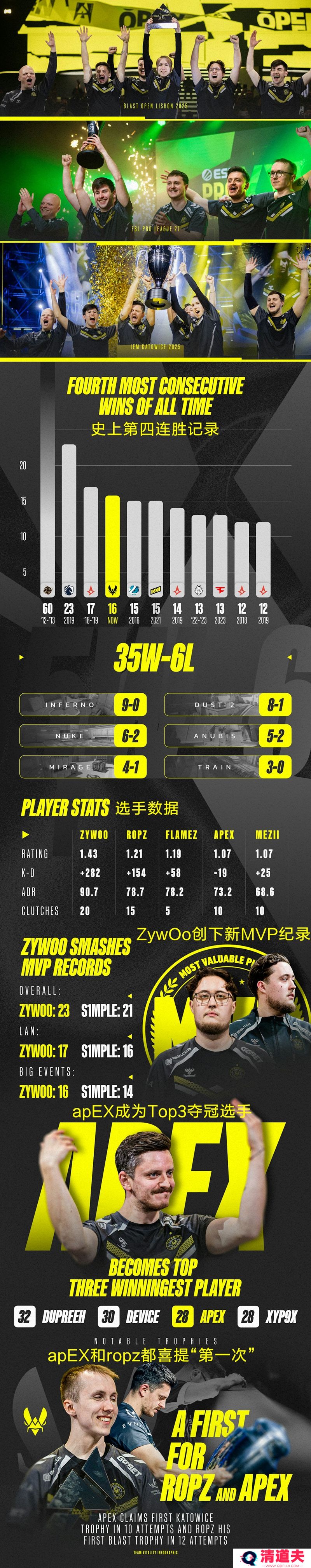 在卡托维兹、斯德哥尔摩和里斯本连续夺得三座奖杯的过程中,Vitality战队不仅打破了多项纪录,对其他队伍发起了挑战,还取得了一些重大的 “首次” 成就。