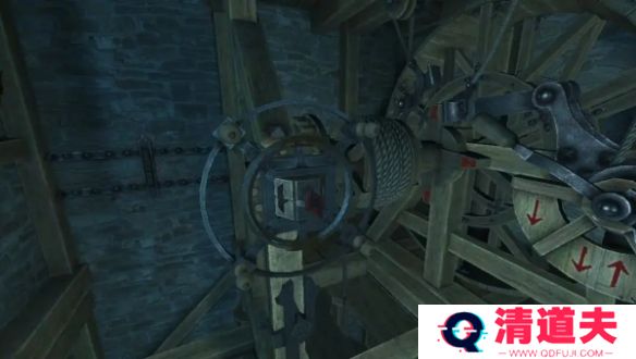 11、将绞轮机关部件插入凸形槽中,再旋转绞轮,装置被推出,回到楼上,向左拉动把手,再拉动电梯把手,旋转绞轮转轮,使通向楼下的绳子降落。