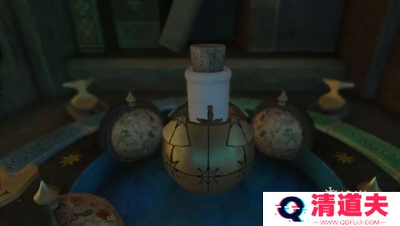 16、将花朵机关插入桌上的插孔中,旋转书架下右侧的圆盘,拖拽滑块,再将精雕木质部件旋转插入,再次旋转即可打开书架,点击得到植物标本集。