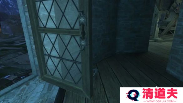 7、来到楼下,旋转火炬,点击得到黄铜部件和椅子上的木头把手,回到楼上,将窗户摇把插入凹槽中,旋转摇把,再拖拽木头滑块。
